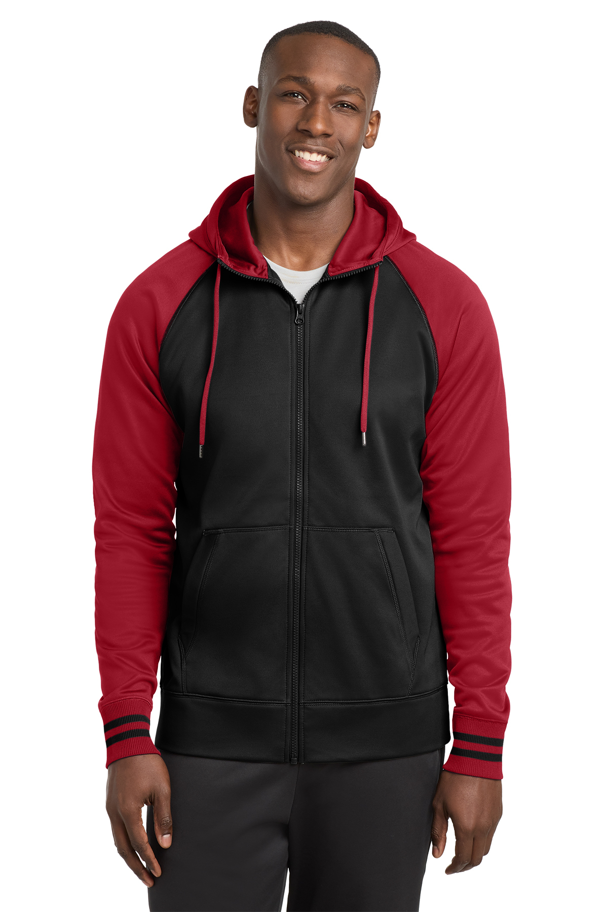 5.5-ounce, 100% polyester Tag-free label Three-panel hood Self-fabric hood lining Taped neck Dyed-to-match drawcords with metal tips Raglan sleeves 2x2 rib knit cuffs with yarn dye stripe Front pouch pockets Self-fabric hem